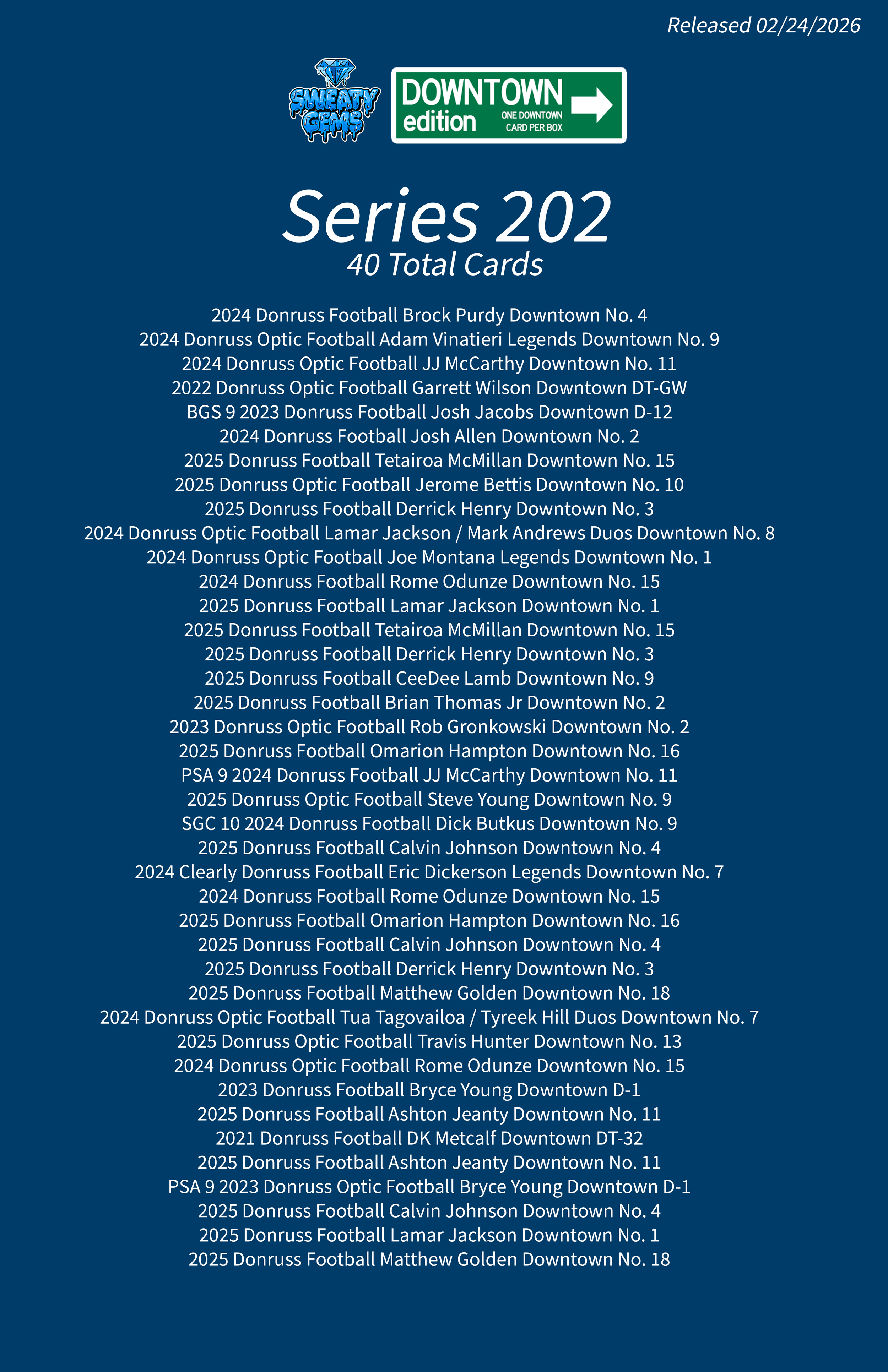 Downtown Edition Series 202 Feb 24 Written By Sweaty Gems LLC . Release date: 02/24/2026. The full product checklist can be found below. Sweaty Gems LLC .