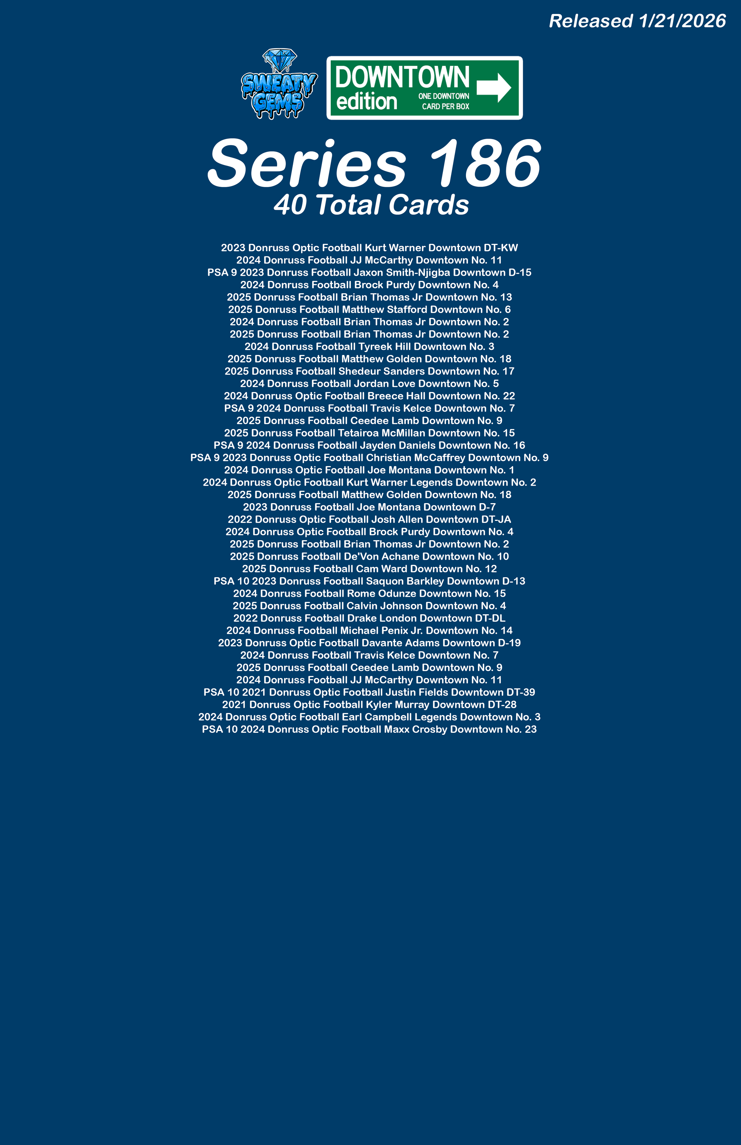 Downtown Edition Series 186 Jan 21 Written By Sweaty Gems LLC . Release date: 01/21/2026. The full product checklist can be found below. Sweaty Gems LLC .