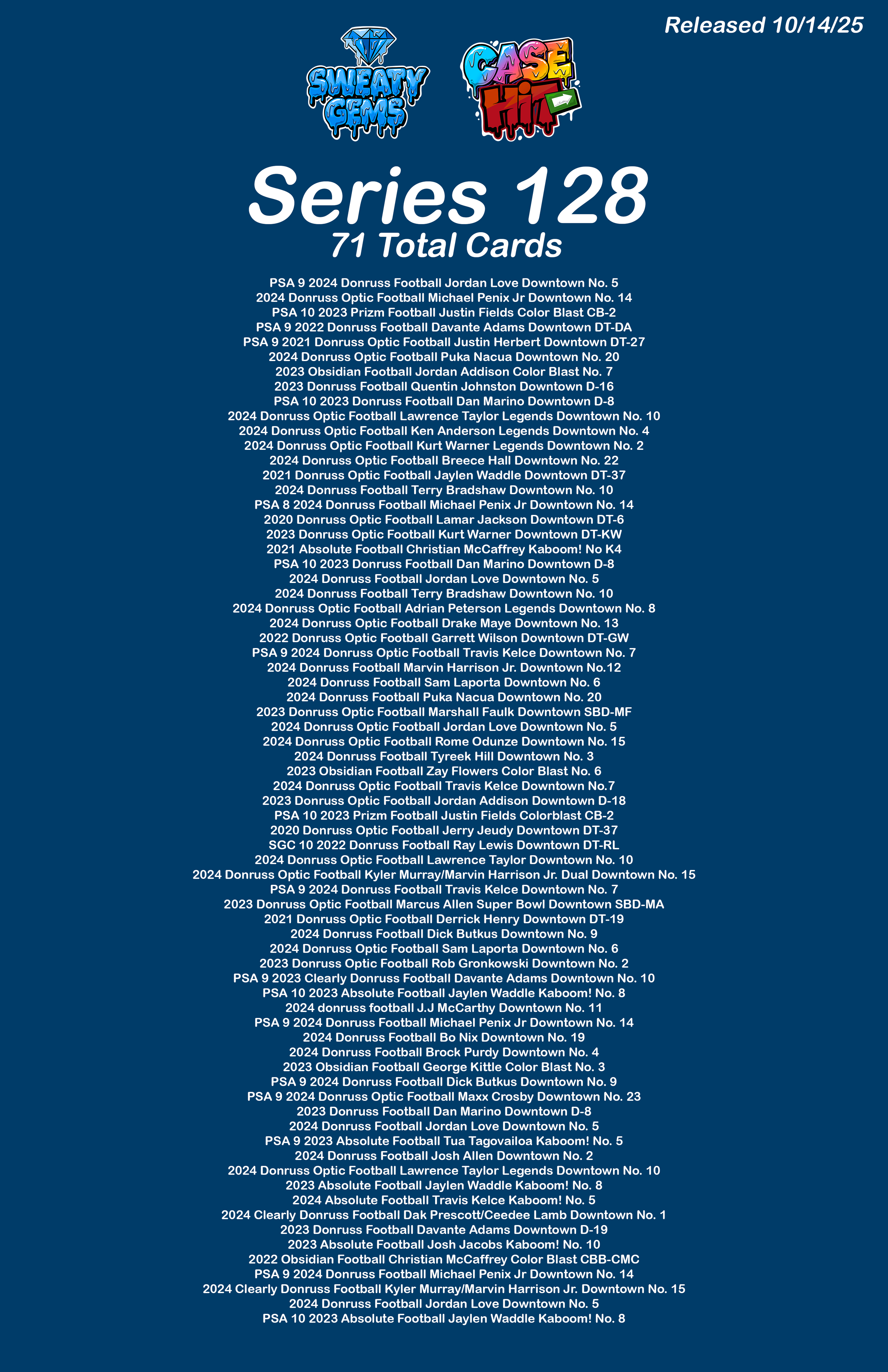 Case Hit Series 128 Checklist Oct 14 Written By Sweaty Gems LLC . Release date: 10/14/2025. The full product checklist can be found below. Sweaty Gems LLC .