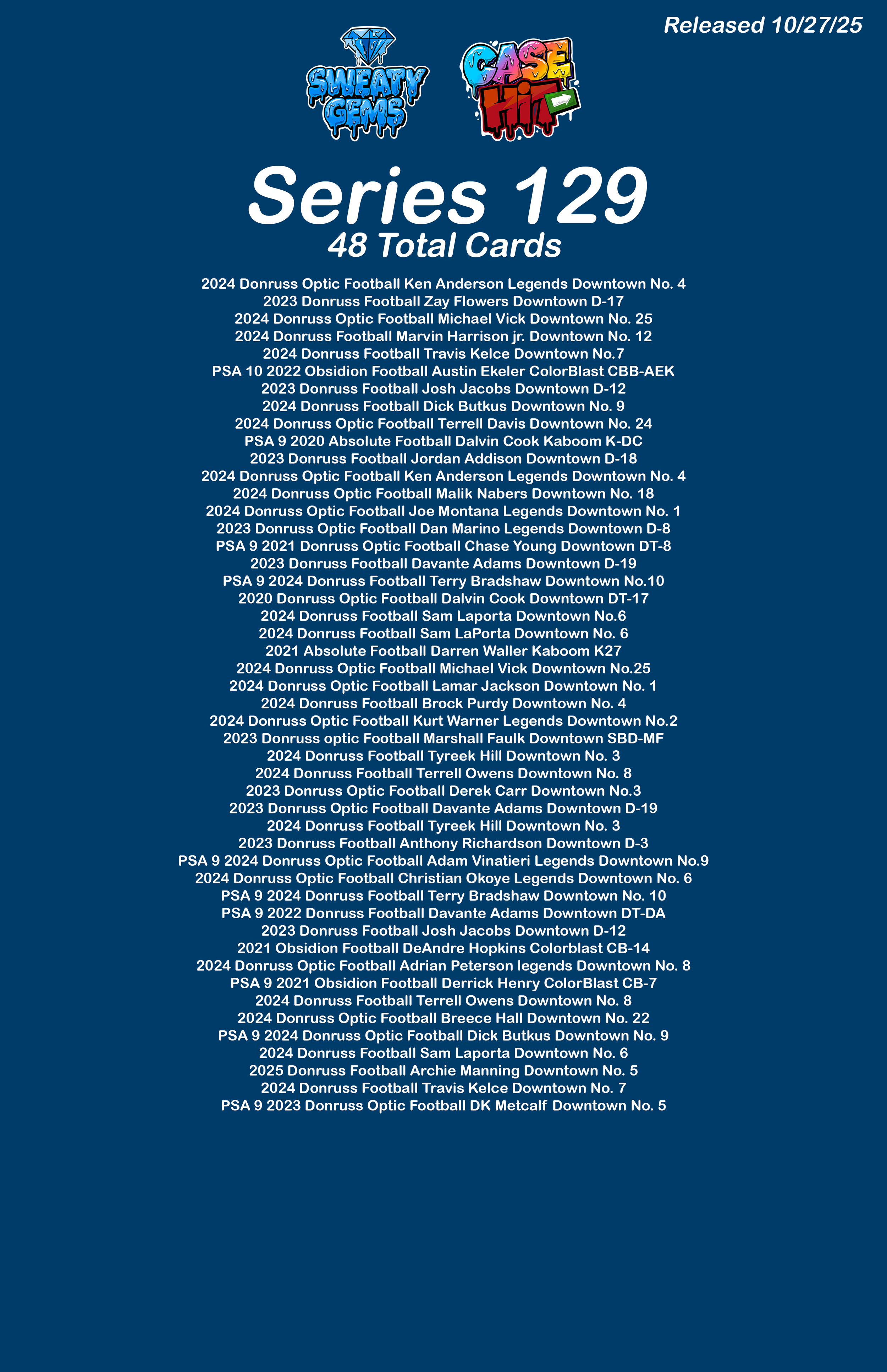Case Hit Series 129 Checklist Oct 27 Written By Sweaty Gems LLC . Release date: 10/27/2025. The full product checklist can be found below. Sweaty Gems LLC .