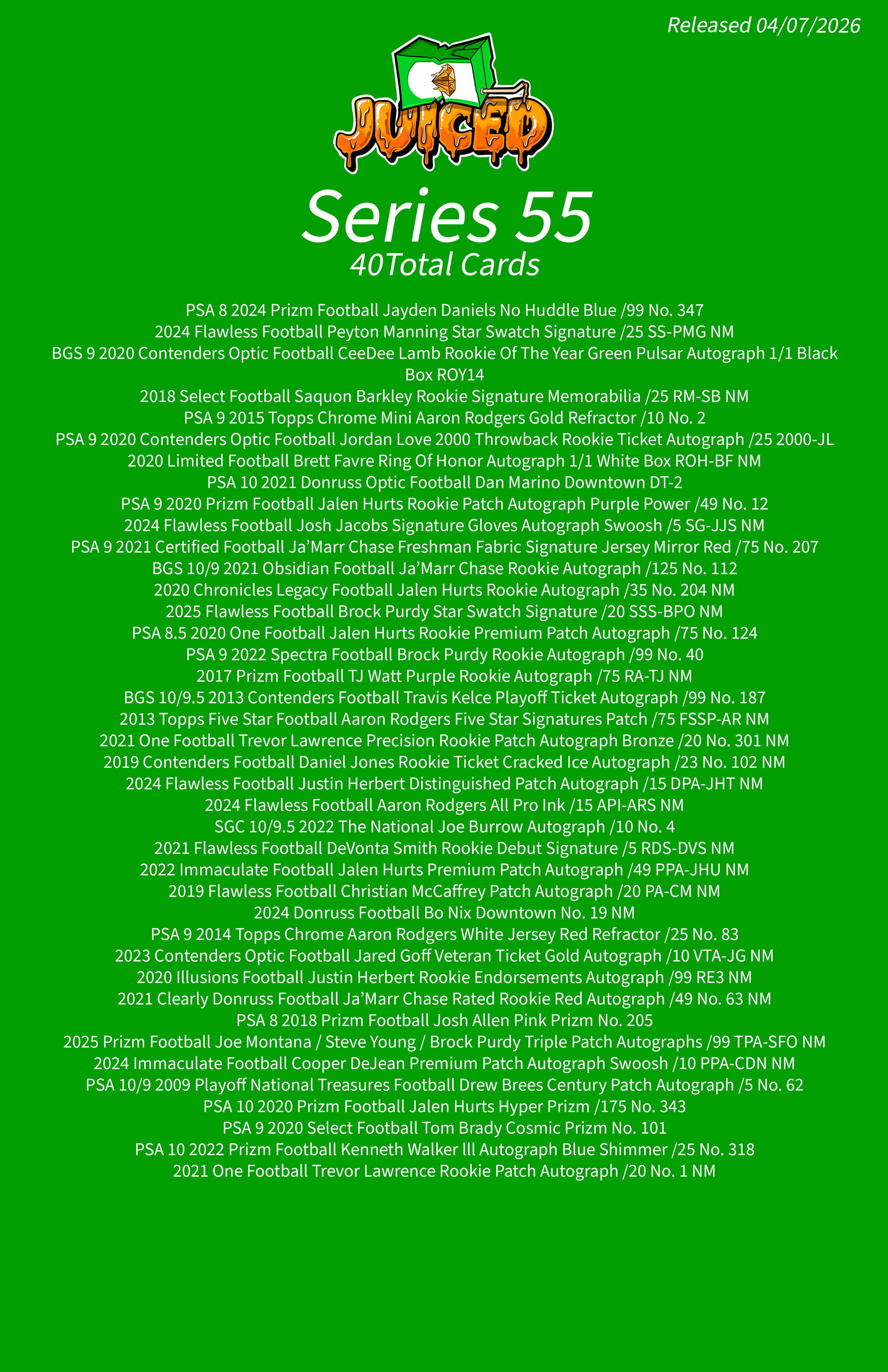 Juiced Series 55 Checklist Apr 7 Written By Sweaty Gems LLC . Release date:04/07/2026. The full product checklist can be found below. Sweaty Gems LLC .