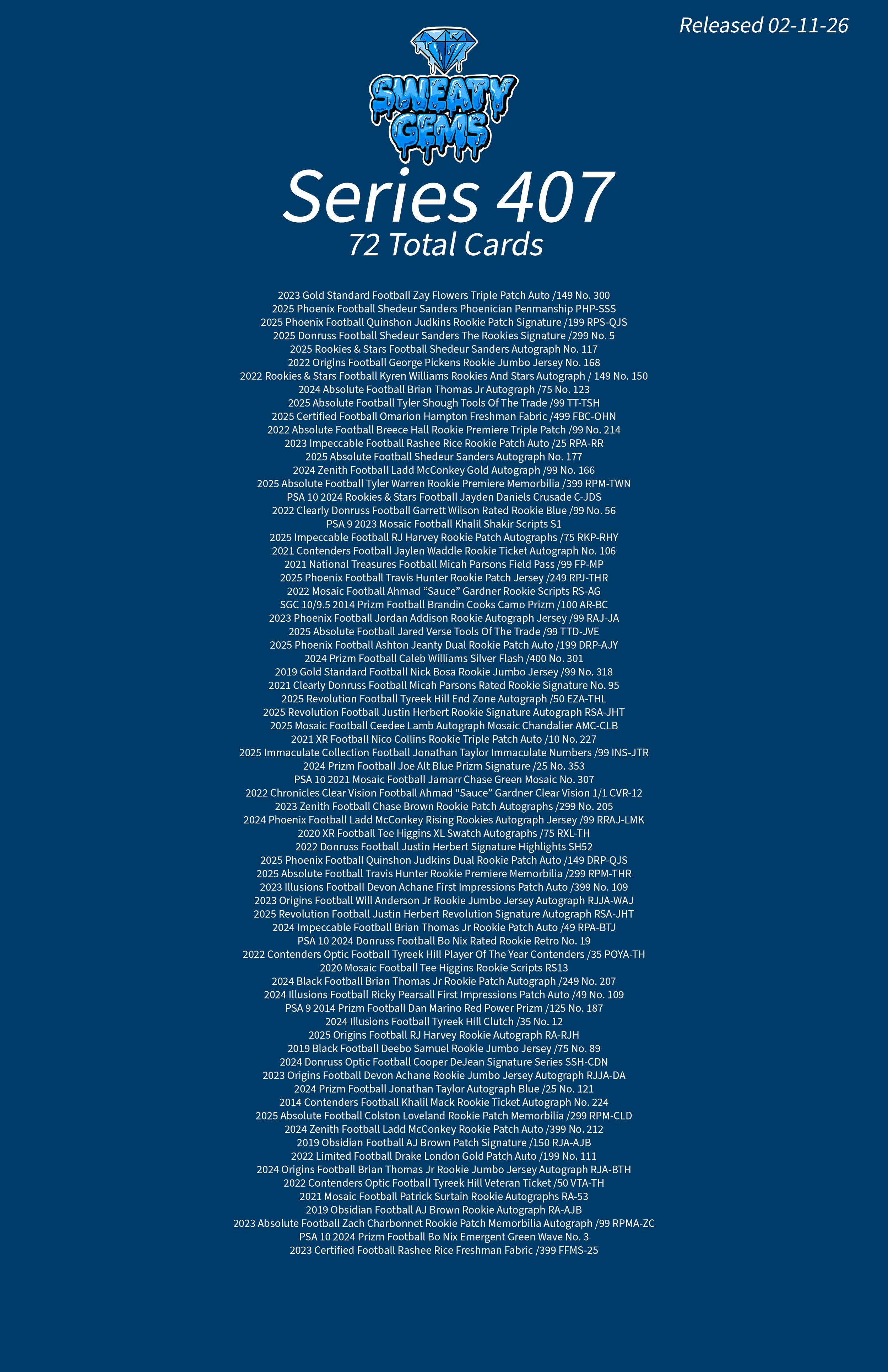 Classic Series 407 Checklist Feb 11 Written By Sweaty Gems LLC . Release date: 02/11/2026. The full product checklist can be found below. Sweaty Gems LLC .