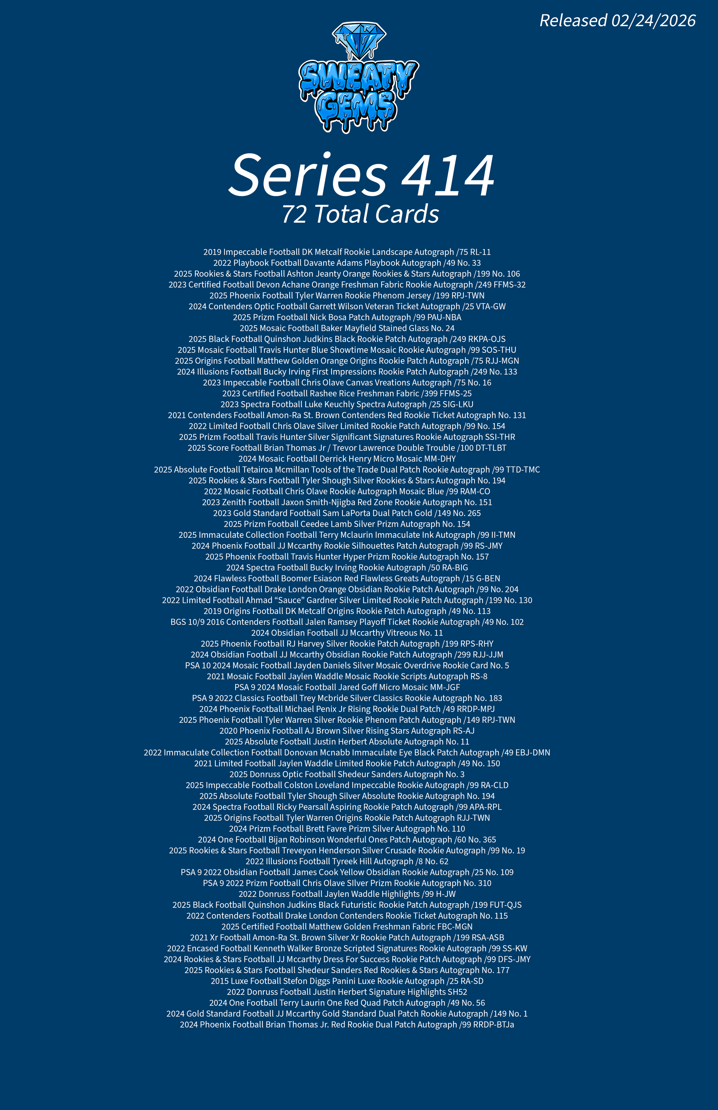 Classic Series 414 Checklist Feb 24 Written By Sweaty Gems LLC . Release date: 02/24/2026. The full product checklist can be found below. Sweaty Gems LLC .