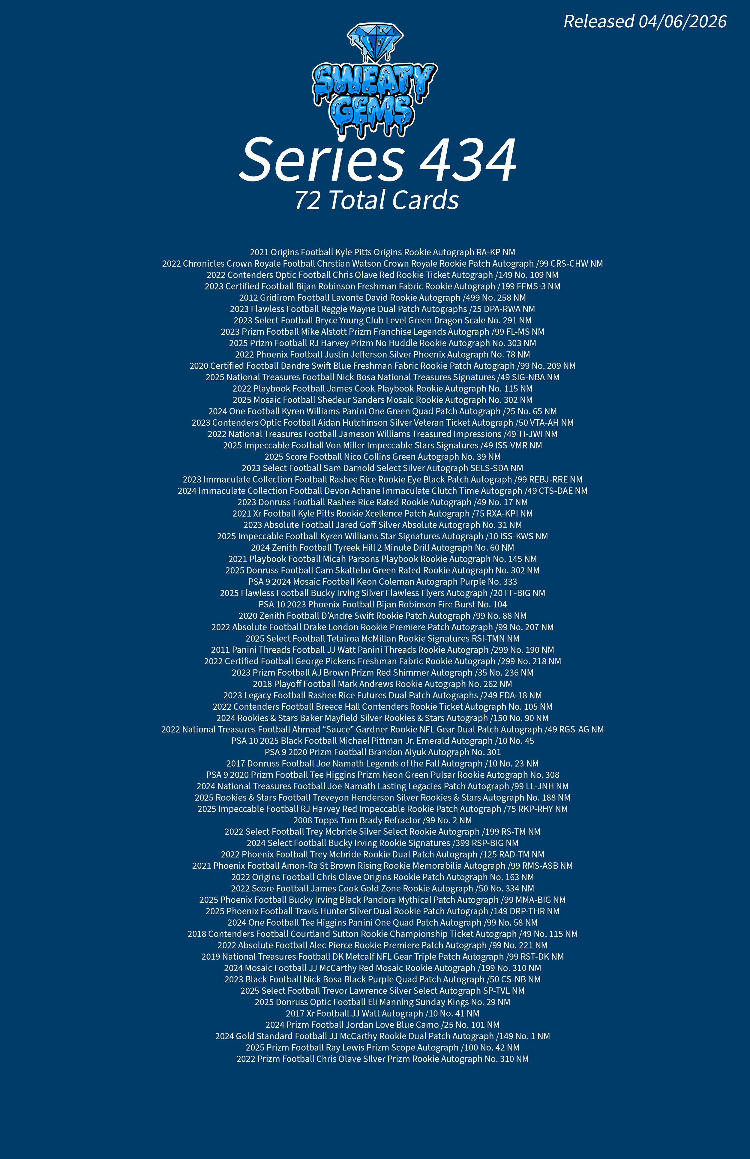 Classic Series 434 Checklist Apr 6 Written By Sweaty Gems LLC . Release date: 04/06/2026. The full product checklist can be found below. Sweaty Gems LLC .