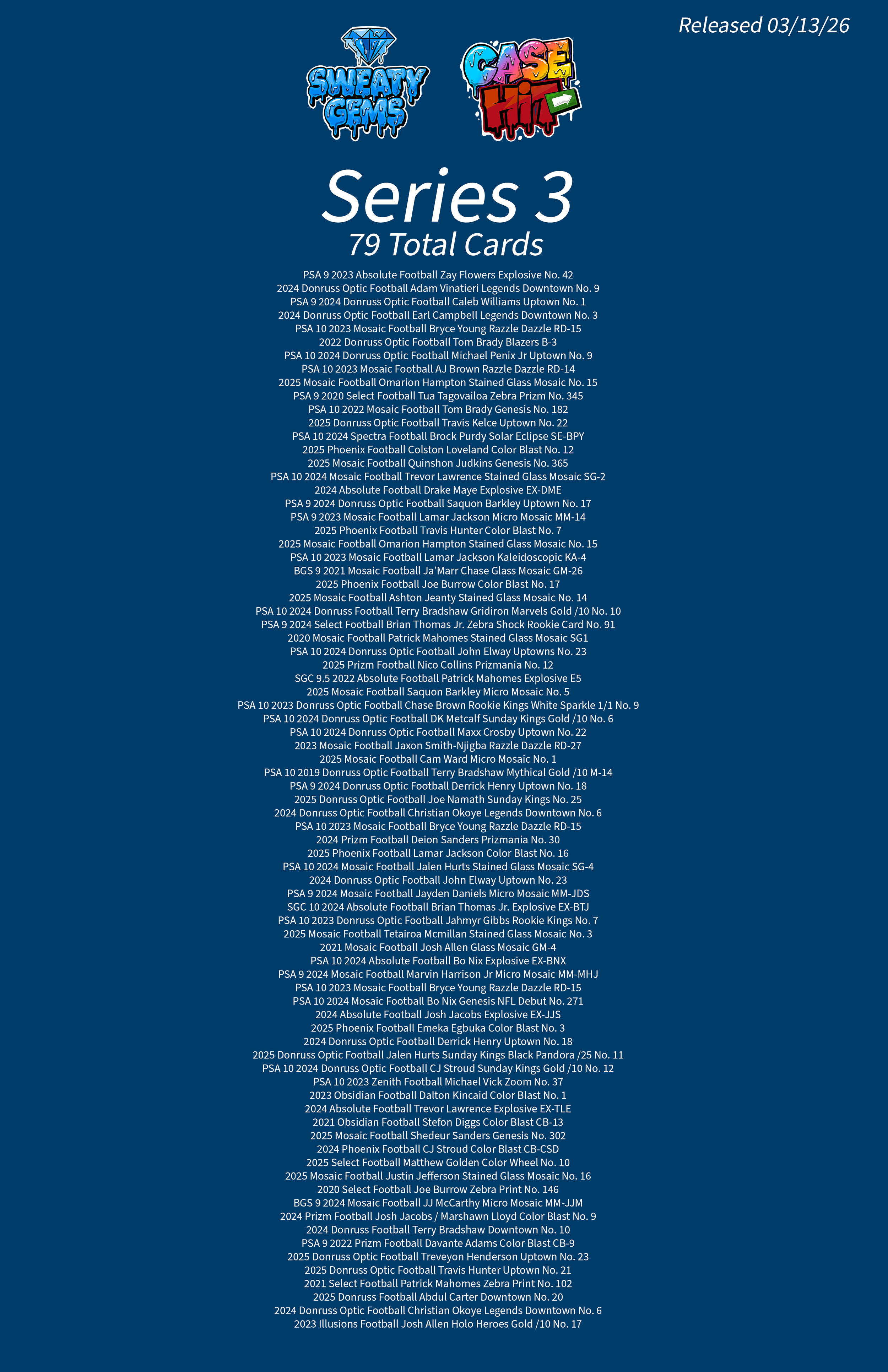 Case Hit Series 3 Checklist Mar 13 Written By Sweaty Gems LLC . Release date: 03/13/2026. The full product checklist can be found below. Sweaty Gems LLC .